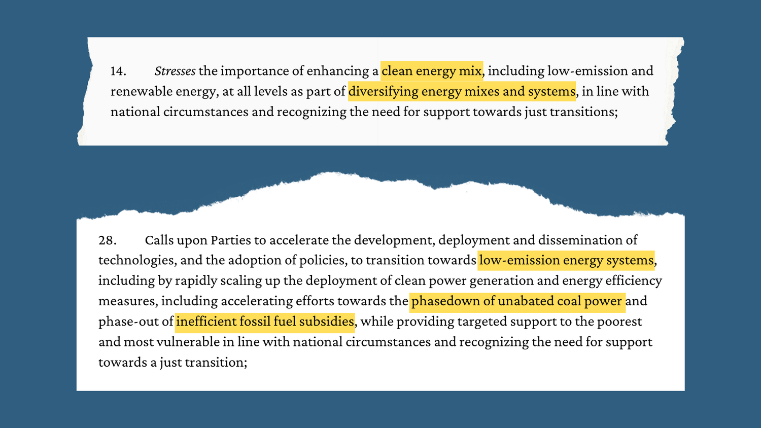 Screenshot from the Sharm el-Sheikh Implementation Plan highlighting the ‘weasel words’ used on sections pertaining to energy and the just transition.