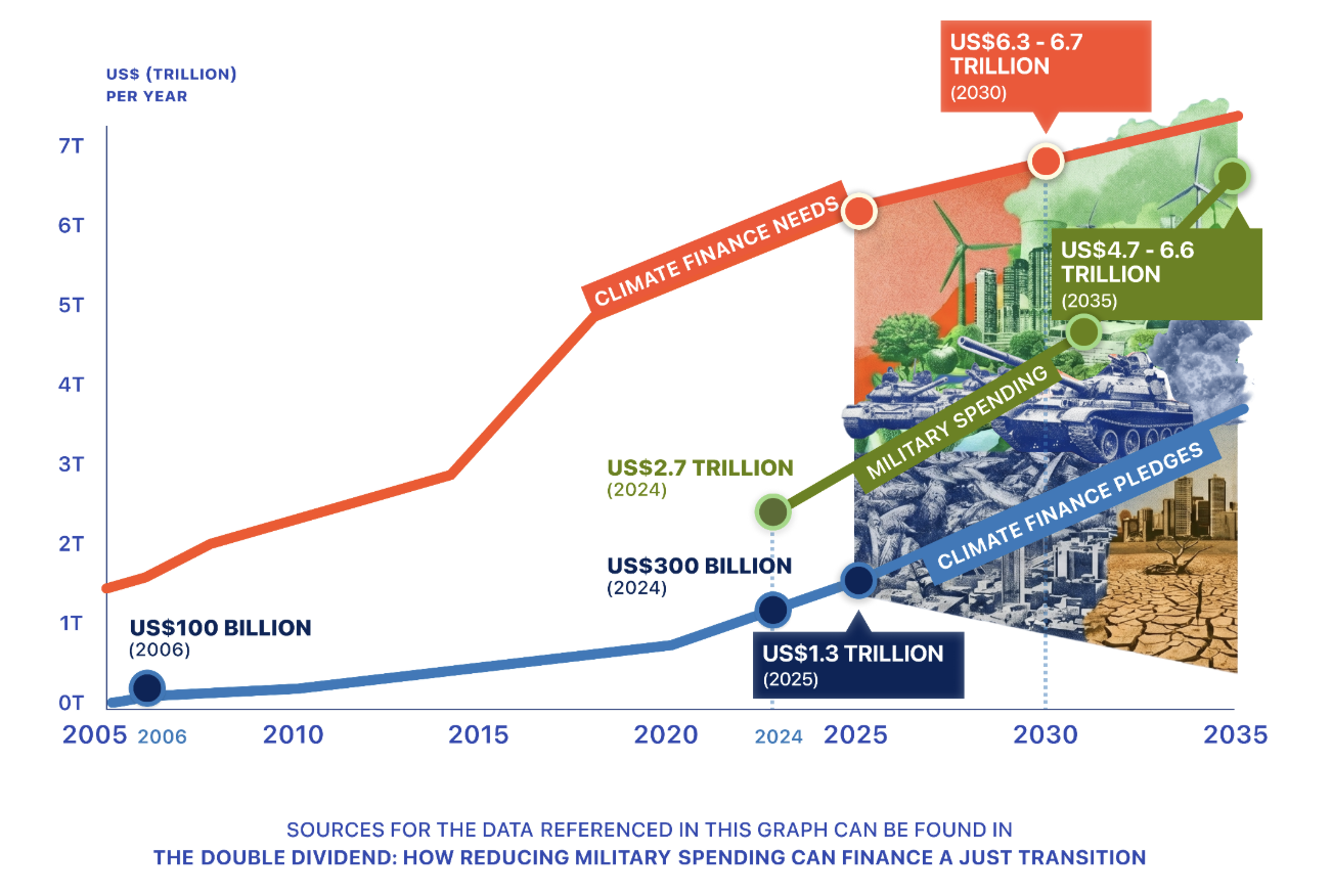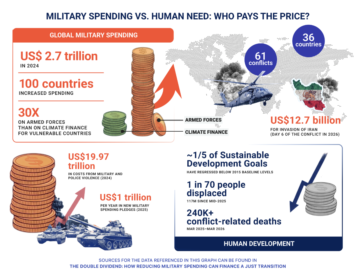 Reducing military spending to finance a global just transition is a win-win in the current global context. The planet is warming at an unprecedented rate, and the past eleven years have been the eleven warmest on record. At the same time, armed conflict and forced displacement are also at their highest level since the end of World War II with 62 conflicts in 36 countries in 2024, more than 117 million people forcibly displaced as of mid-2025. This amount does not even reflect the human, ecological and economic costs of the expanding conflicts and genocide in the Middle East and Ukraine. As of March 2026, more than 240,000 people were killed by conflict-related violence and genocide in the previous twelve months. This is a crisis of priorities, not resources. The wealthiest countries in the world dedicate 30 times more to war than the resources being provided to countries most vulnerable to the impacts of climate change.