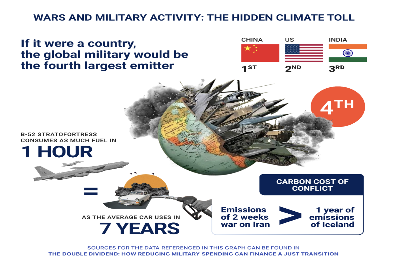 A new report, The Double Dividend: How Reducing Military Spending Can Finance a Just Transition examines the deep structural links between militarism, fossil fuel dependence and the climate crisis. It highlights that global military spending reached a record US$2.7 trillion spending by 100 countries in 2024. In 2025, this number rose to US$2.88 trillion and could reach US$4.7 to US$6.6 trillion by 2035. Spending by the largest militaries was 30 times greater than the climate finance currently being directed towards the world’s most vulnerable nations.