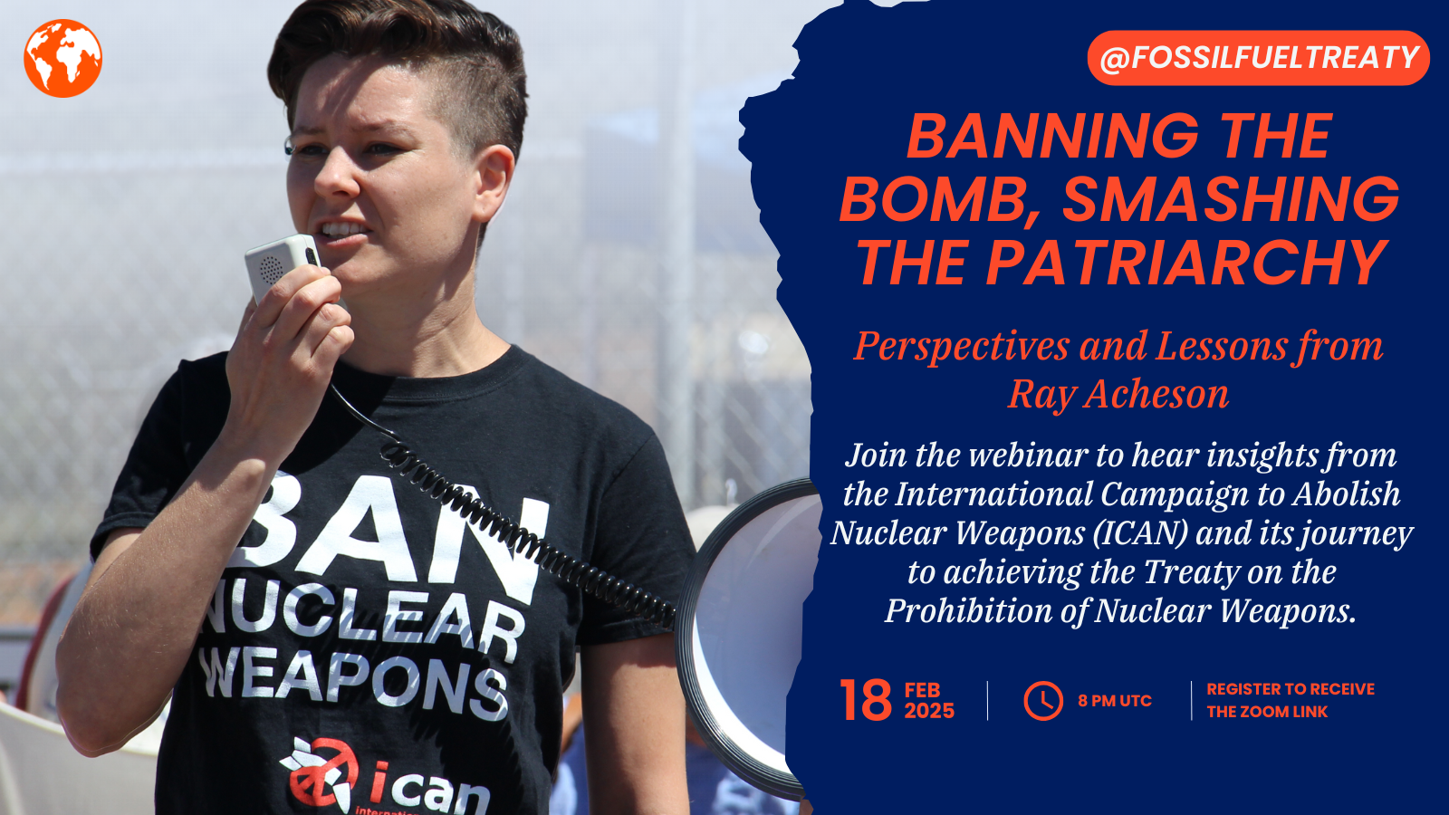We invite you to join our webinar, "Banning the Bomb, Smashing the Patriarchy," featuring Ray Acheson, Director of Reaching Critical Will, the disarmament program of the Women's International League for Peace and Freedom (WILPF), the world’s oldest feminist peace organization. Ray will share valuable insights from the International Campaign to Abolish Nuclear Weapons (ICAN) and its journey to achieving the Treaty on the Prohibition of Nuclear Weapons, adopted in 2017 and entering into force in 2021.