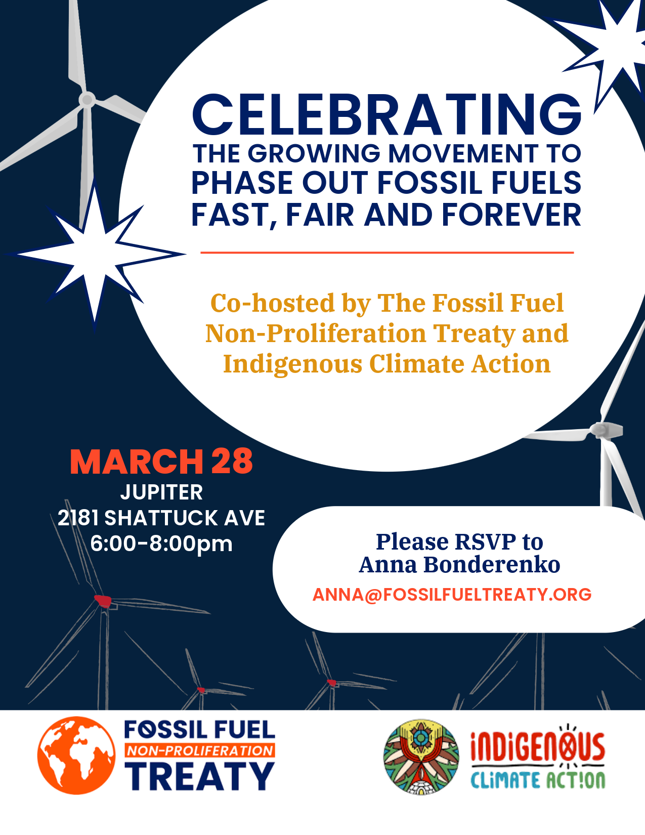 CELEBRATING THE GROWING MOVEMENT TO PHASE OUT FOSSIL FUELS FAST, FAIR AND FOREVER Thursday, March 28, 2024 11:00 AM 1:00 PM Jupiter 2181 Shattuck Avenue Berkeley, CA, 94704 United States (map) Google Calendar ICS