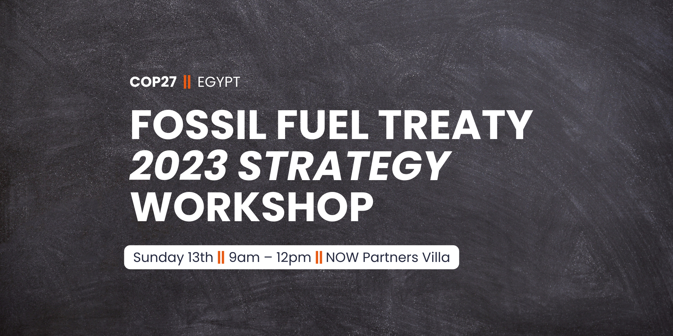Treaty Network Strategy Workshop Sunday, November 13, 2022 1:00 AM 3:30 AM NOW Partners Villa 70 Moscow street, El Montazah Sharm El Sheikh Egypt (map) Google Calendar ICS Join an in-person workshop in Sharm El-Sheikh on the sidelines of COP27 to discuss the 2023 strategy for the global campaign for a Fossil Fuel Non-Proliferation Treaty. All partners welcome. Register on Eventbrite Register Now