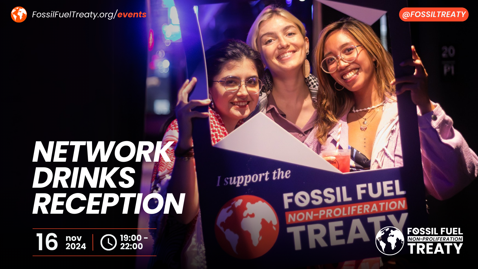 Join us for a convivial moment with friends and allies to unwind during the hectic weeks of COP29. We will be offering drinks and light snacks in a relaxed atmosphere where you can network and exchange with supporters of the Fossil Fuel Non-Proliferation Treaty from across the globe.