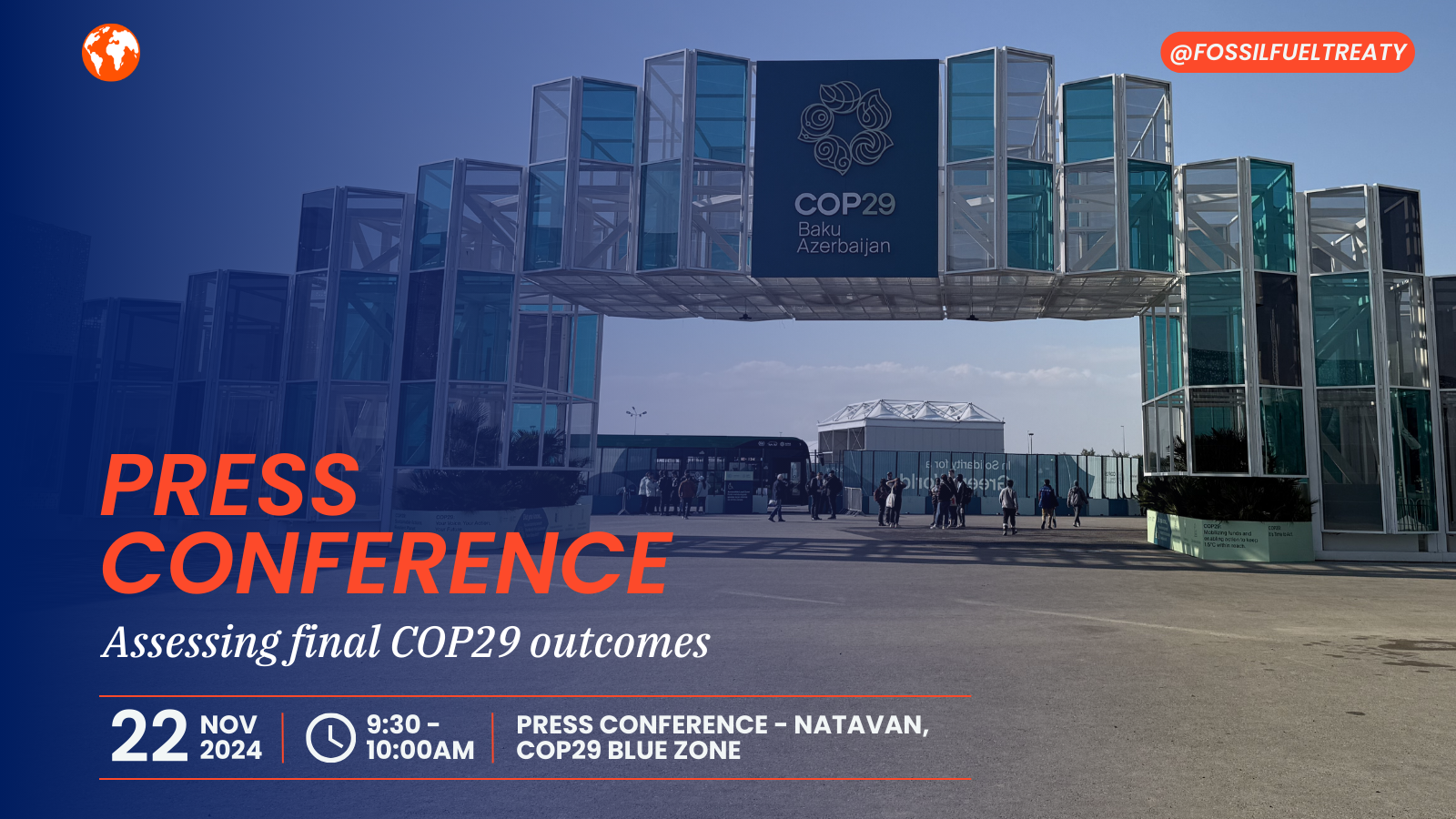 Press Conference: Assessing COP29 outcomes Friday, November 22, 2024 1:30 AM 2:00 AM Google Calendar ICS As COP29 draws to a close, the Fossil Fuel Non-Proliferation Treaty Initiative hosts experts and campaigners as they share their analysis of the key issues and outcomes and look forward to COP30.