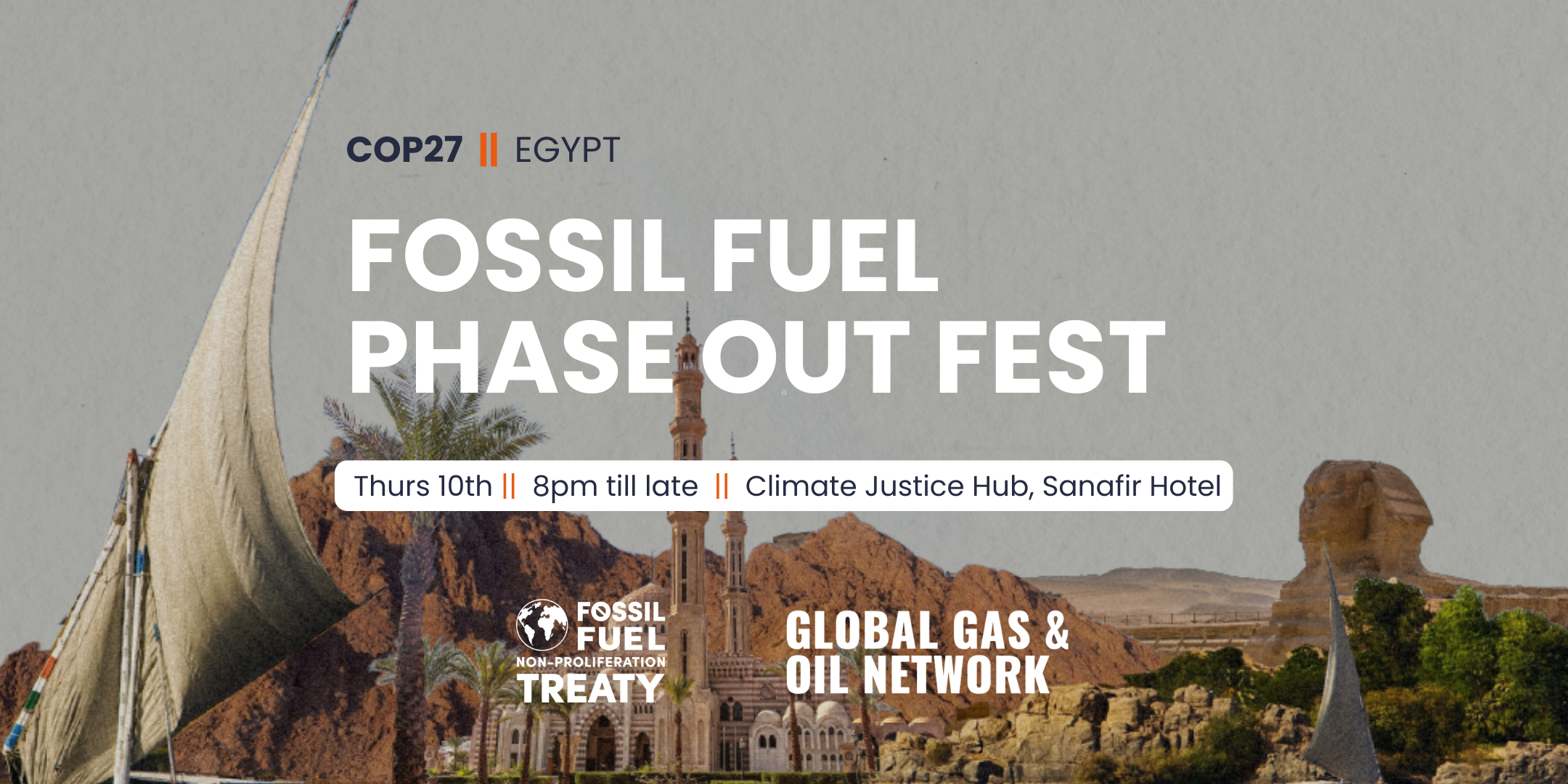 Fossil Fuel Phase Out Fest Thursday, November 10, 2022 12:00 PM 3:00 PM Climate Justice Hub @ the Sanafir Hotel . South Sinai Governorate, 8763114 Egypt (map) Google Calendar ICS Join a social night for anyone advocating for a global just transition away from coal, oil and gas. Hosted by the Fossil Fuel Non-Proliferation Treaty Initiative and the Global Gas and Oil Network. Drinks and food to be provided. RSVP on Eventbrite Click here to RSVP