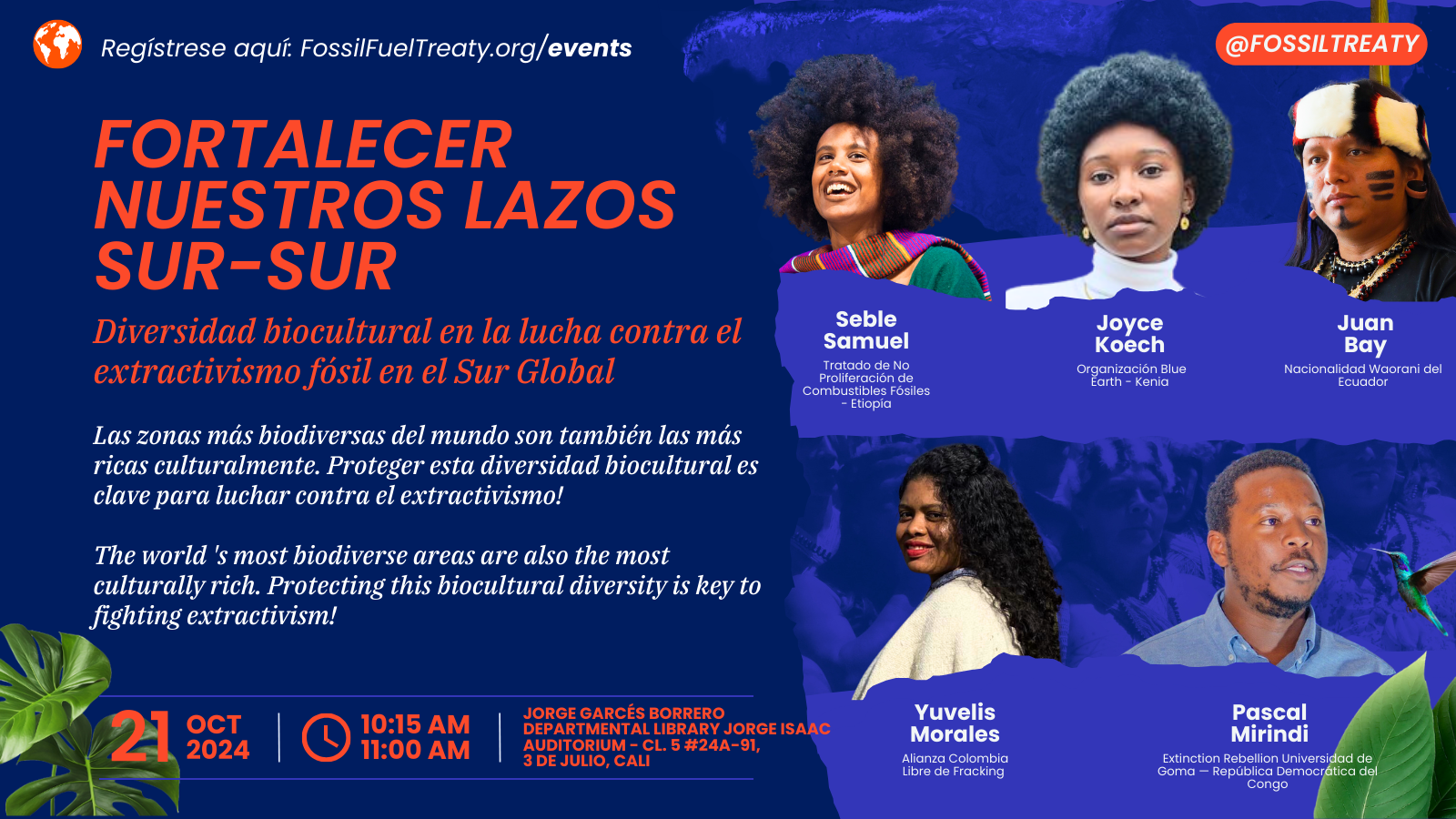 The most biodiverse areas of the planet are also the most culturally diverse, this biocultural diversity must be cared for and safeguarded as our existence as humanity is linked to the health of these megadiverse places. Making this correlation explicit is crucial to deepen the conversation in these spaces where biodiversity of fauna and flora is discussed, and cultural diversity and the work of the communities are left aside. It is also key to strengthen the links between the most biodiverse regions and also those most plundered by the fossil fuel industry, which is responsible for the greatest amount of greenhouse gas emissions, in order to create a more solid and organized network of resistance and action against the extractivism that we see increasing more and more. In this way we will address how the initiatives of 'non-proliferation or extractivism and fossil fuel free zones' have been developing both in Latin America and Africa.