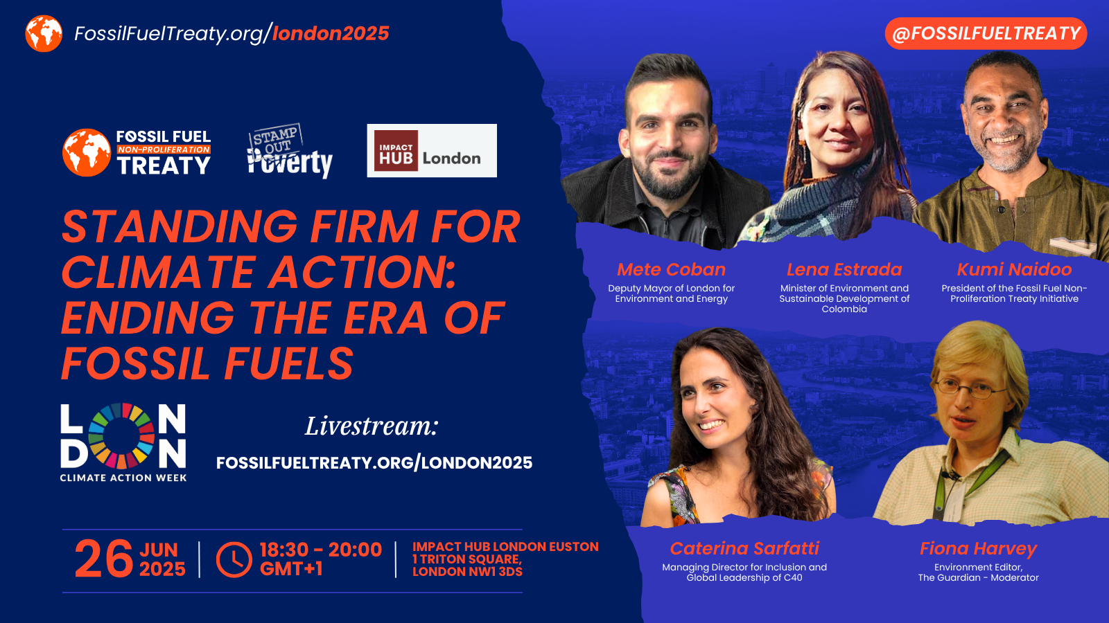 Hosted by the Fossil Fuel Non-Proliferation Treaty, Stamp Out Poverty and Impact Hub London as part of London Climate Action Week, this event is an opportunity to discuss bold plans, powerful alliances, and the growing global movement to phase out coal, oil and gas. We need to hold polluters to account and build a just, democratic transition that leaves no one behind. Together we’re building a lifeline.