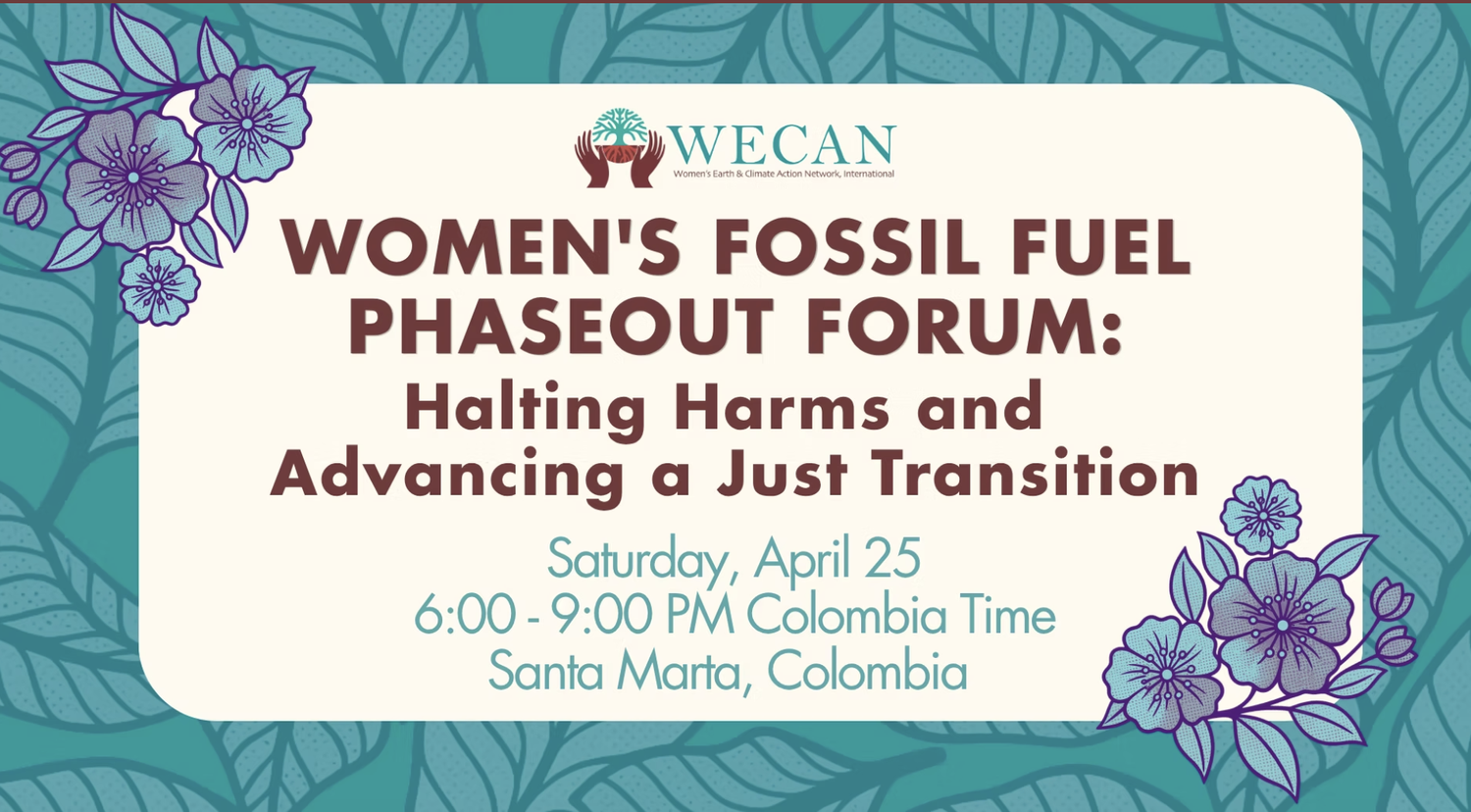 To build a healthy and equitable future, we must transform our local and global systems, and champion a regenerative, rights-based approach that prioritizes communities and nature, tackling the root causes of our intertwined social, economic, and climate crises. Please join us in-person in Santa Marta, Colombia for an inspiring and strategic WECAN event on April 25 from 6:00 - 9:00PM COT, "Women's Fossil Fuel Phaseout Forum: Halting Harms and Advancing a Just Transition."