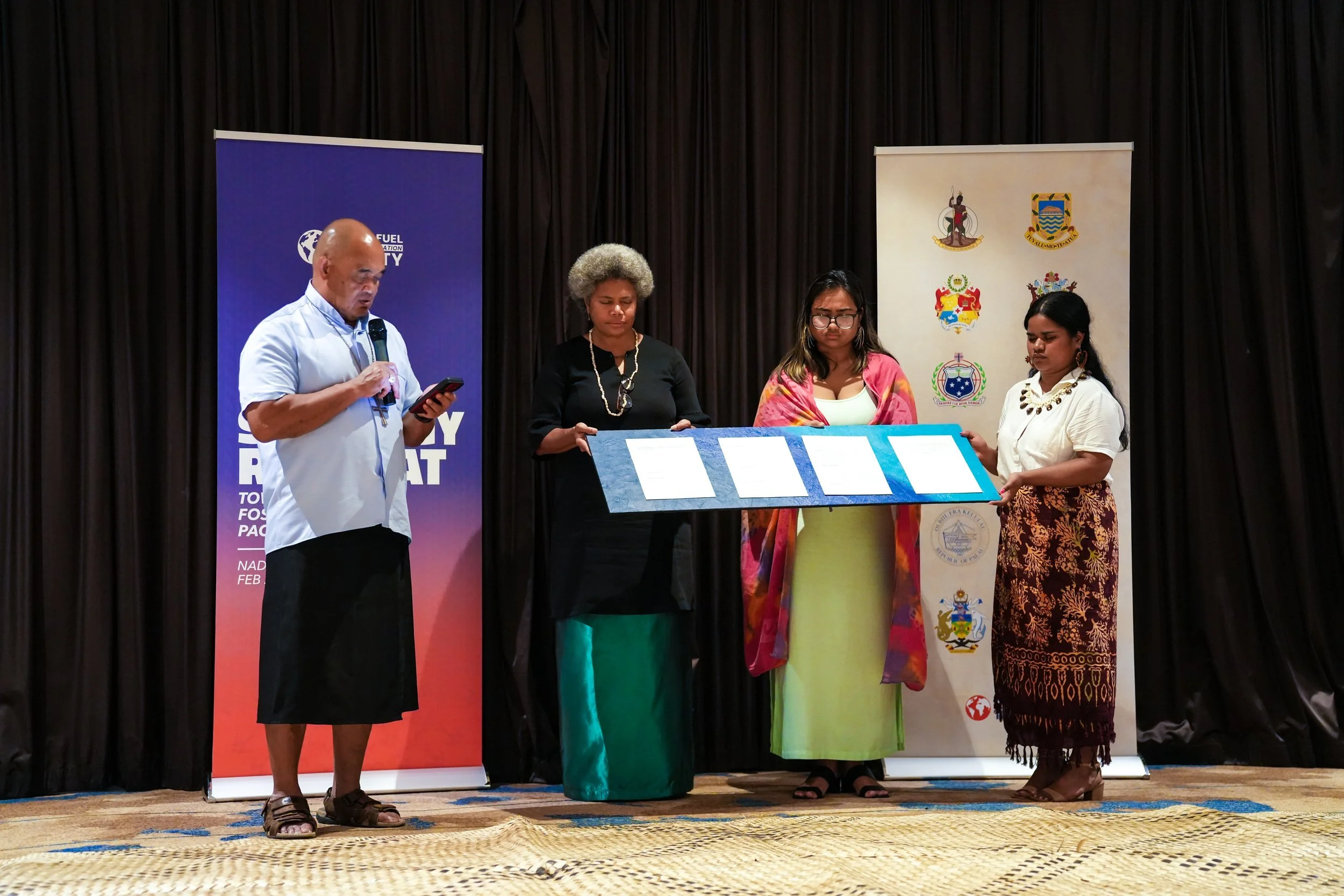Archbishop Peter Loy Chong delivers a blessing during the handover of the Naiuli Declaration in Nadi, Fiji from Antonia Bhagwan and Berty Lakjohn, representing Pacific civil society, to Hon. Lenora Qereqeretabua, representing the Government of Fiji and 12 nation-states who have endorsed the Fossil Fuel Treaty Initiative.